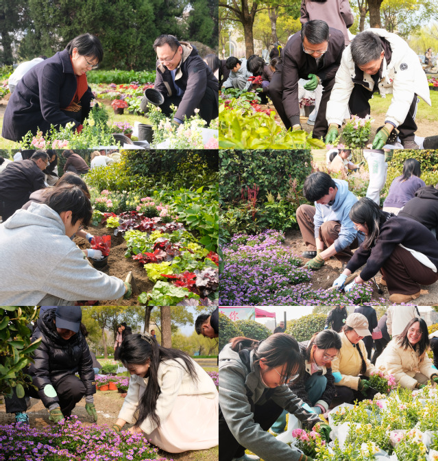 参与师生完成分组后,依次领取花卉小苗和劳动工具。大家在养护师傅的耐心指导下,逐一实践培土、栽植等环节。和煦的春光映照着师生热火朝天的身影,大家齐心协力,让每一株小苗稳稳扎根,让每一片色块填充饱满,在江湾校区形成亮丽的一景。